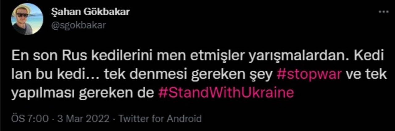 "En son Rus kedilerini men etmişler yarışmalardan. Kedi lan bu kedi... Tek denmesi gereken şey #StopWar ve tek yapılması gereken de #StandWithUkraine"