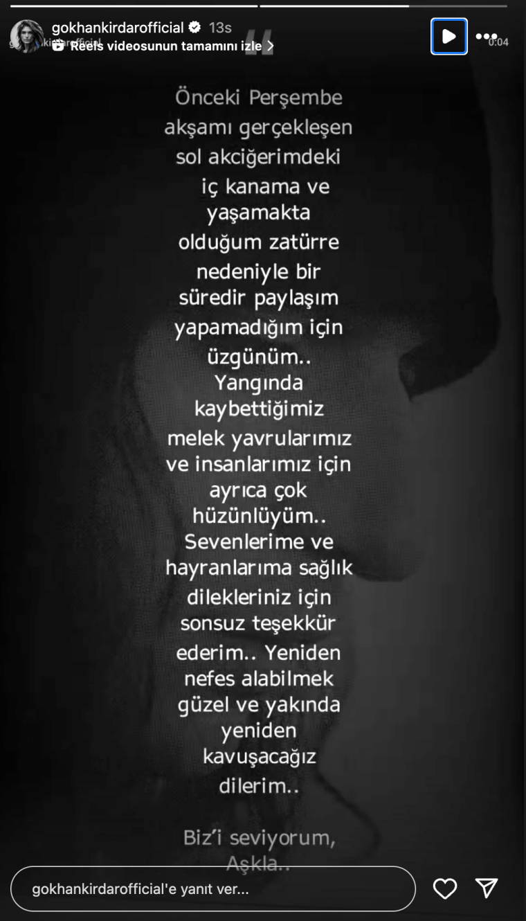 "Önceki Perşembe akşamı gerçekleşen sol akciğerimdeki iç kanama ve yaşamakta olduğum zatürre nedeniyle bir süredir paylaşım yapamadığım için üzgünüm… Yangında kaybettiğimiz yavrularımız ve insanlarımız için ayrıca çok hüzünlüyüm. Sevenlerime ve hayranlarıma sağlık dilekleriniz için sonsuz teşekkürler ederim. Yeniden nefes alabilmek güzel ve yakında yeniden kavuşacağız dilerim."