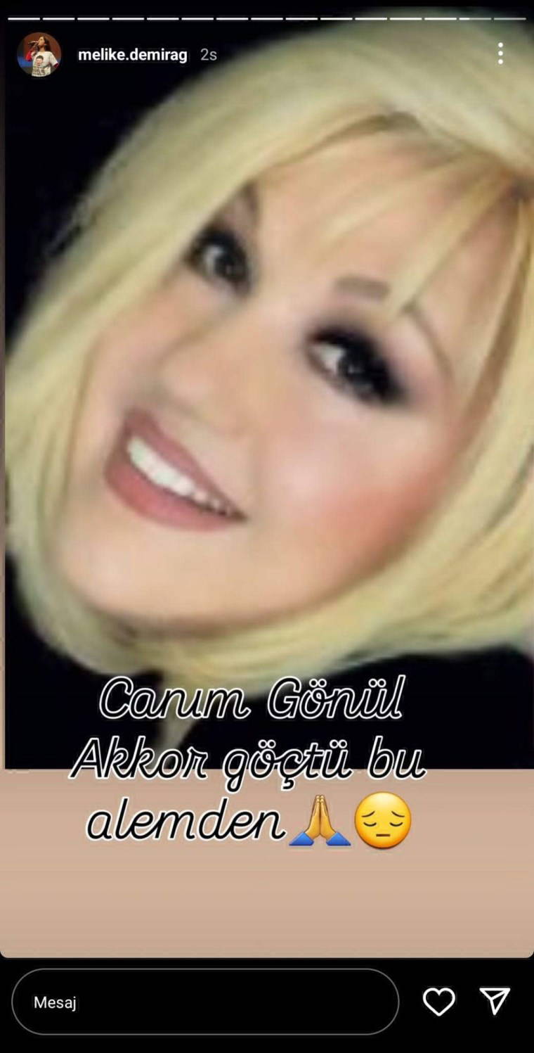 Demirağ, Instagram hesabından yaptığı hikaye paylaşımında, "Canım Gönül Akkor geçti bu alemden" yazdı.