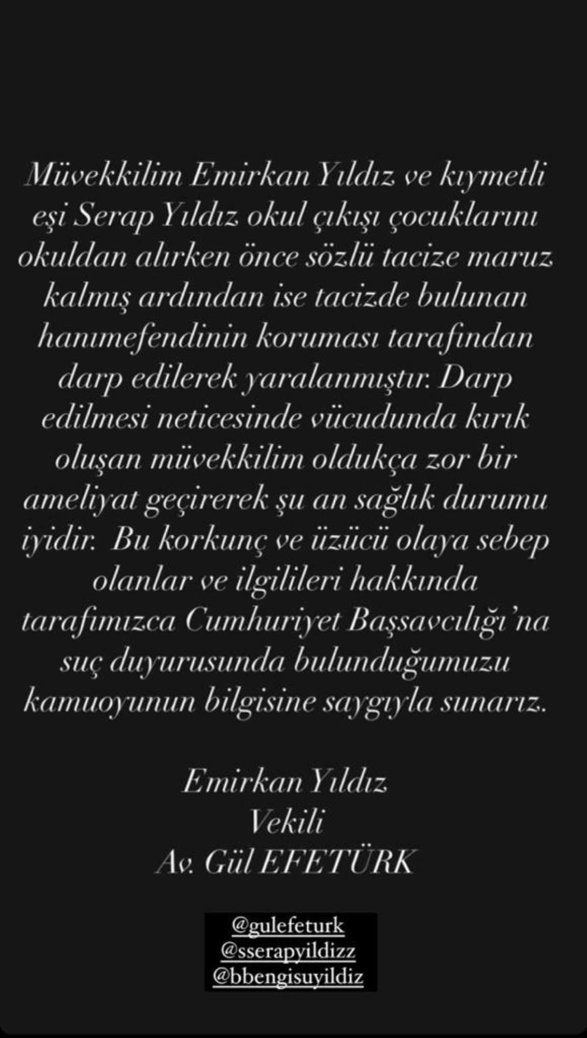 Yaşanan korkunç olayın ardından Emirkan'ın sosyal medya hesabından yapılan paylaşımda "Sanatçımız Emirkan okul çıkışı oğlunu almaya gittiğinde aracını park ettiği mülkün kadın eşi tarafından önce sözlü tacize sonrasında özel koruması tarafından tahrik ve hakaretle başlayan arbede sonucu düşüp omzunu kırmıştır. Ameliyata alınacaktır. Hukuki haklarımızı avukatlarımızla takipçisi olacağız" denildi.