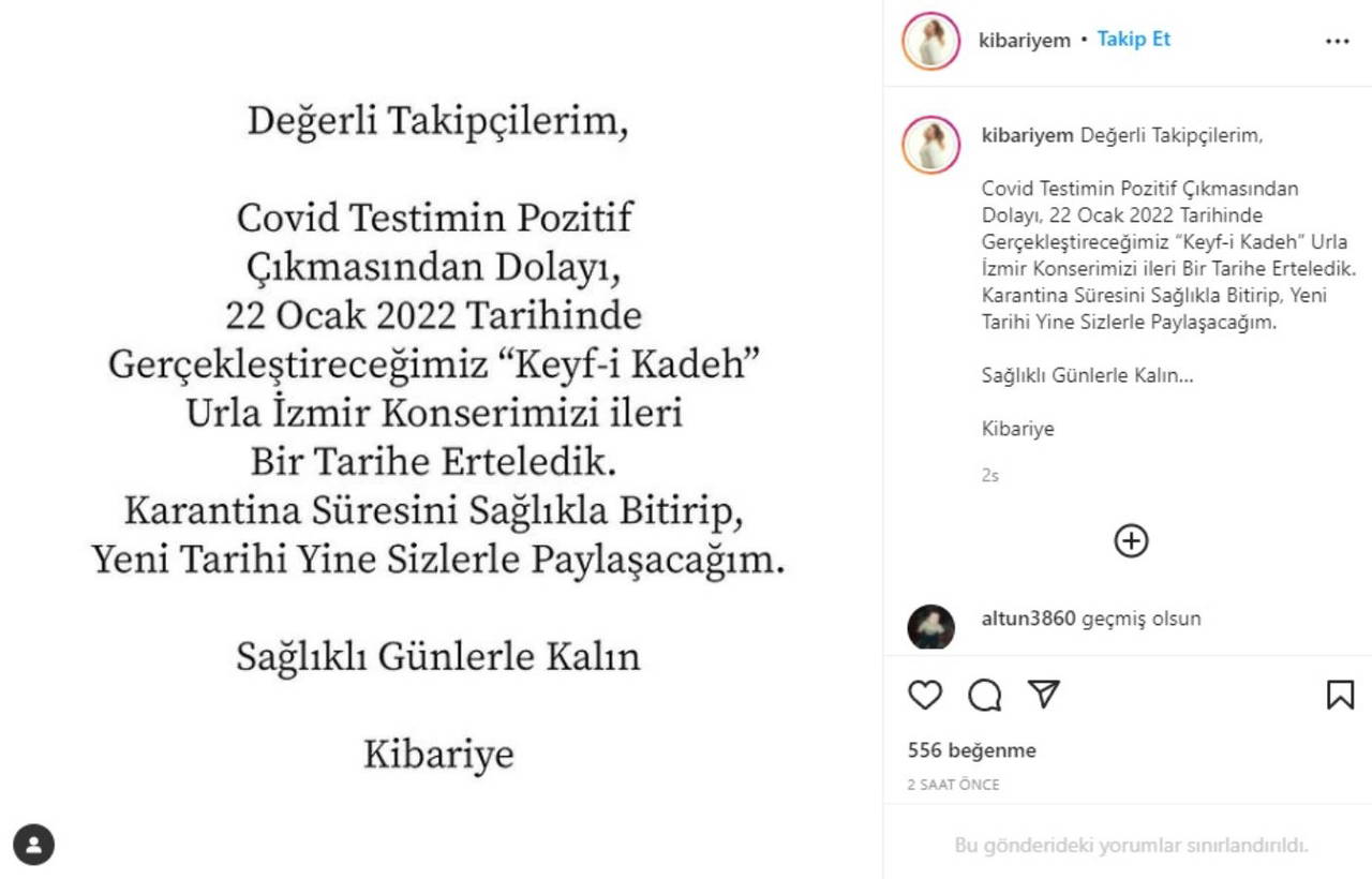 PCR testi pozitif çıkan Kibariye, haberi sosyal medya hesabından duyurdu. Sanatçı, 22 Ocak Cumartesi günü gerçekleşmesi beklenen konserini de ileri bir tarihe erteleyeceğini açıkladı.