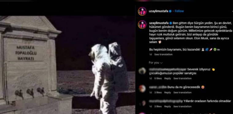 "Uzaylı" lakabıyla bilinen şarkıcı Mustafa Topaloğlu'ndan ilk Türk astronot Alper Gezeravcı'nın uzaya yolculuğuna başlamasının ardından bir paylaşım geldi.