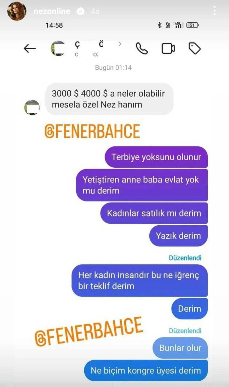 Fenerbahçe kongre üyesi olduğu öğrenilen kişi hakkında Nez, "Bu şahsa sizde iki kelime yazınız lütfen yettiniz artık. Çok terbiyesizsiniz. Yazıklar olsun gerçekten yazıklar olsun. Bir de Fenerbahçe kongre üyesiymiş. Bir de çocuğunun fotoğrafı var. 'Hesap çalındı', 'başkası yazdı' bla bla... Yettiniz artık... Utanın ama sizde o utanma da olmaz ki" ifadelerini kullandı.
