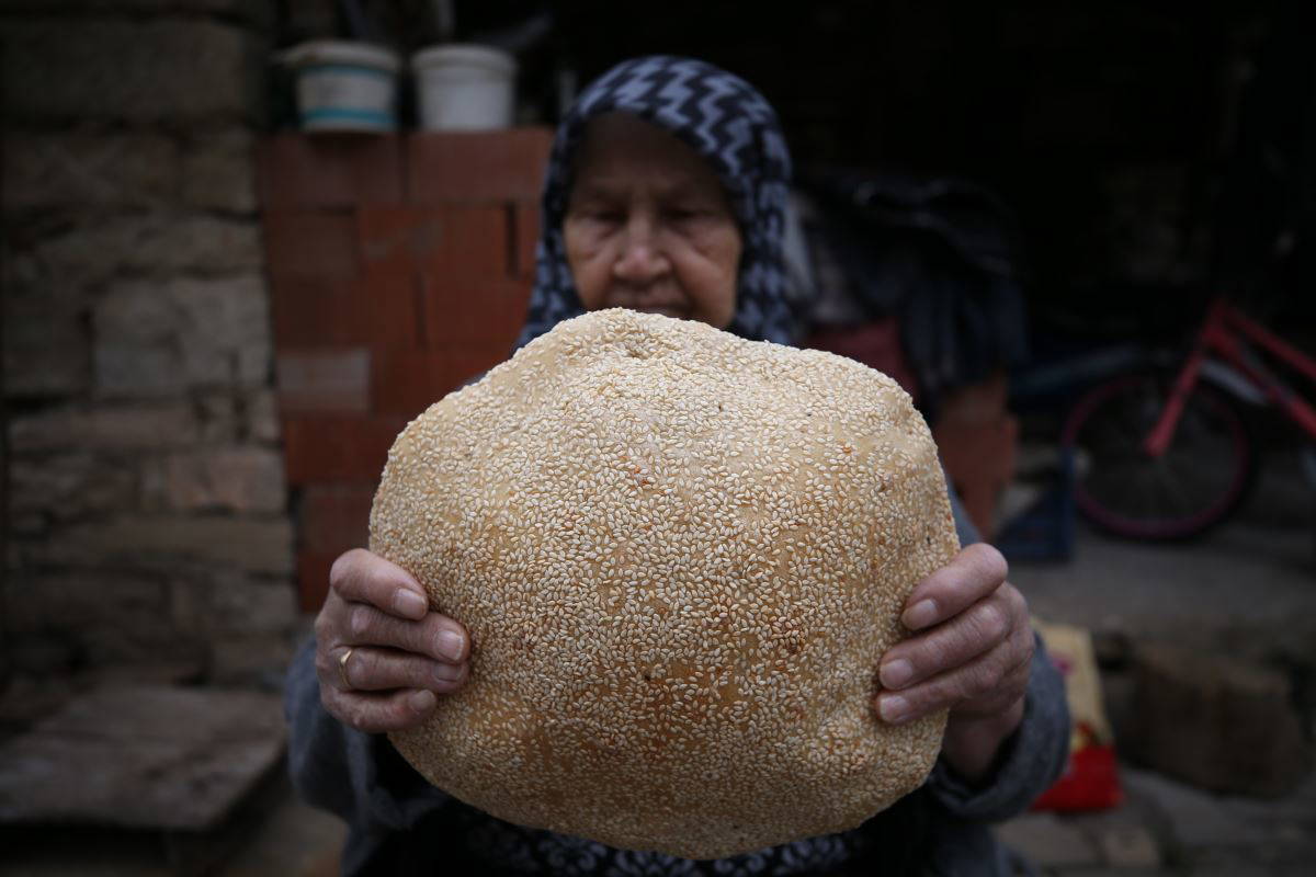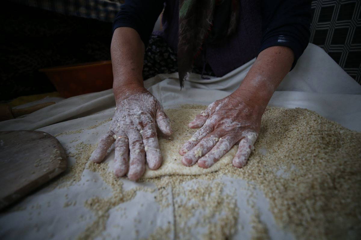 "Hamur karıştırdığımız maya ile kabarıp kıvama gelince elimizde açıp susam döküyoruz. Daha sonra bahçemizdeki fırında pişiririz. Sonra da boş odaya sereriz, isteyen buzdolabına koyar, isteyen kurutur, o şekilde muhafaza eder. Tadı bize çok lezzetli gelir, hem ekmek gibi hem çörek niyetine tüketiyoruz. Hamurumuzun mayası da bize ninelerimizden kalma."
