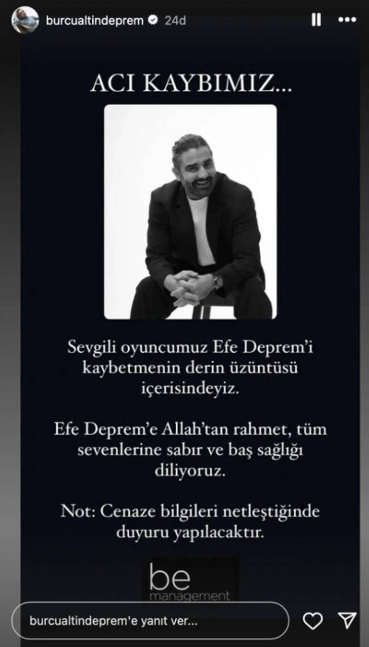 Deprem'in kendisi gibi oyuncu eşi Burcu Altın Deprem sosyal medya hesabından eşinin ölümünü ise şu paylaşımla duyurdu: