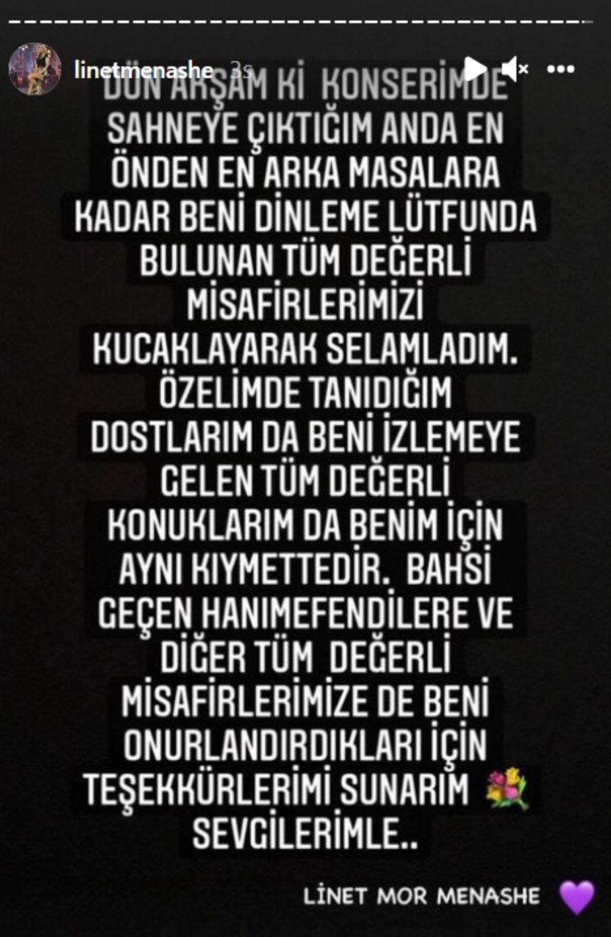 "Dün akşamki konserimde sahneye çıktığım anda en önden en arka masalara kadar beni dinleme lütfunda bulunan tüm değerli misafirlerimizi kucaklayarak selamladım. Özelimde tanıdığım dostlarım da, beni izlemeye gelen tüm değerli konuklarım da benim için aynı kıymettedir. Bahsi geçen hanımefendilere ve diğer tüm değerli misafirlerimize de beni onurlandırdıkları için teşekkürlerimi sunarım. Sevgilerimle..."