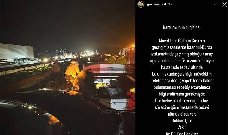 "Müvekkilim Gökhan Çıra, geçtiğimiz saatlerde İstanbul-Bursa istikametinde gerçekleşen 7 araçlık ağır zincirleme trafik kazası sebebiyle hastanede tedavi altındadır."
