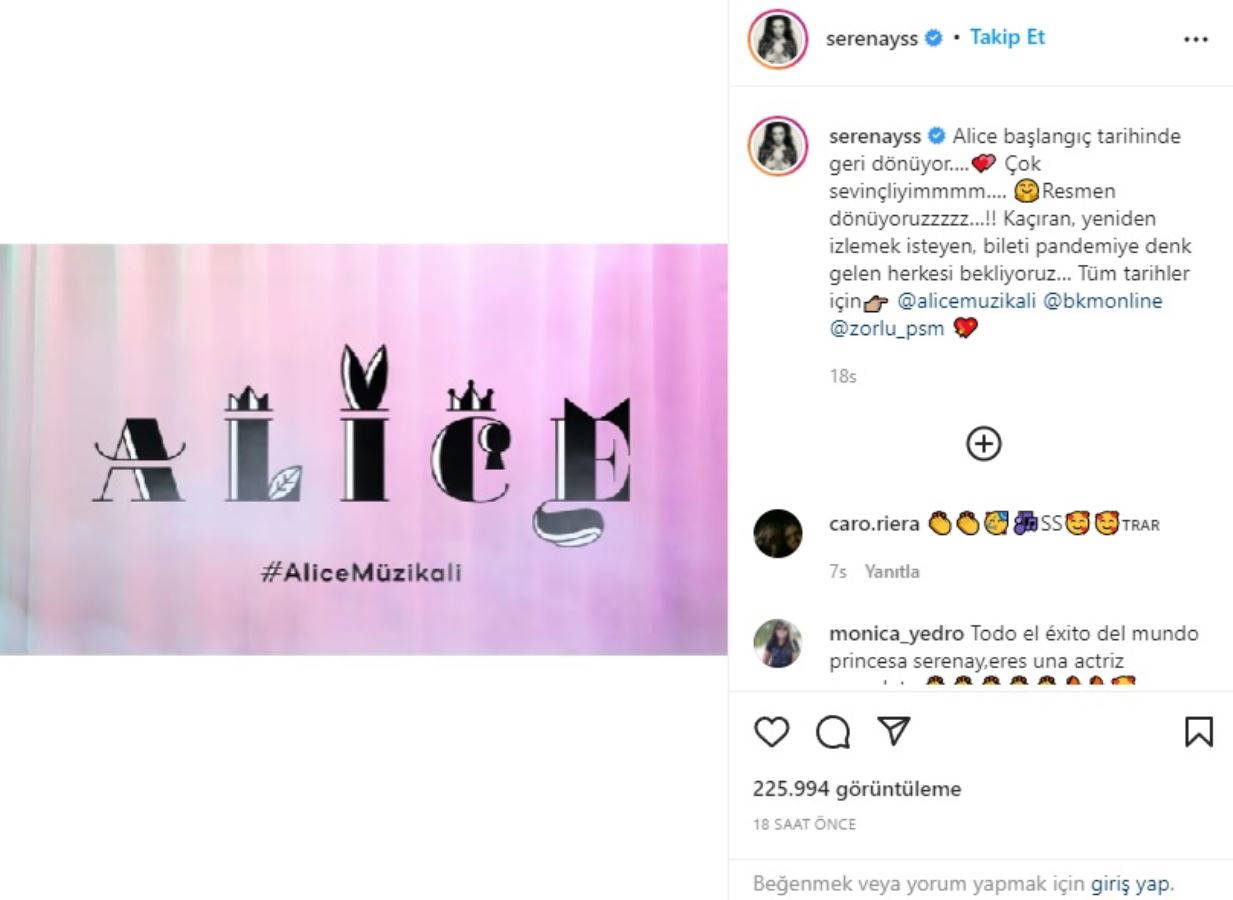 Sevindiren haberi sosyal medya hesabından paylaşan, müzikalin 'Alice'i ve ünlü oyuncu Sereney Sarıkaya, "Alice başlangıç tarihinde geri dönüyor... Çok sevinçliyimmmm…. Resmen dönüyoruzzzzz…!! Kaçıran, yeniden izlemek isteyen, bileti pandemiye denk gelen herkesi bekliyoruz…" ifadelerini kullandı.