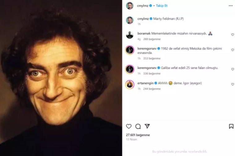 Ayrık gözleriyle tanınan İngiliz komedyen Marty Feldman'ın fotoğrafını paylaşan Yılmaz'ın, Sarıkaya'nın "göğüslerine gönderme" yaptığı düşünüldü.