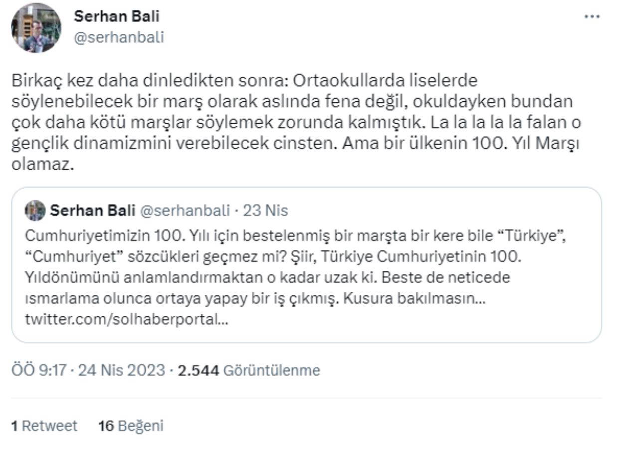 Sosyal medye hesabından paylaşım yapan Bali, "Cumhuriyetimizin 100. Yılı için bestelenmiş bir marşta bir kere bile 'Türkiye', 'Cumhuriyet' sözcükleri geçmez mi? Şiir, Türkiye Cumhuriyeti'nin 100. Yıldönümünü anlamlandırmaktan o kadar uzak ki. Beste de neticede ısmarlama olunca ortaya yapay bir iş çıkmış. Kusura bakılmasın…" dedi.
