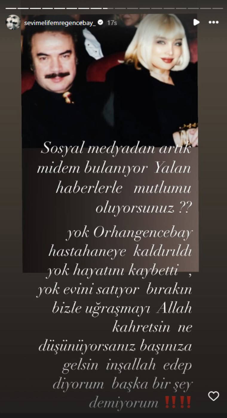 "Sosyal medyadan artık midem bulanıyor. Yalan haberlerle mutlu mu oluyorsunuz? Yok Orhan Gencebay hastaneye kaldırıldı, yok hayatını kaybetti, yok evini satıyor. Bırakın bizimle uğraşmayı. Allah kahretsin. Ne düşünüyorsanız başınıza gelsin inşallah. Edep diyorum, başka bir şey demiyorum."