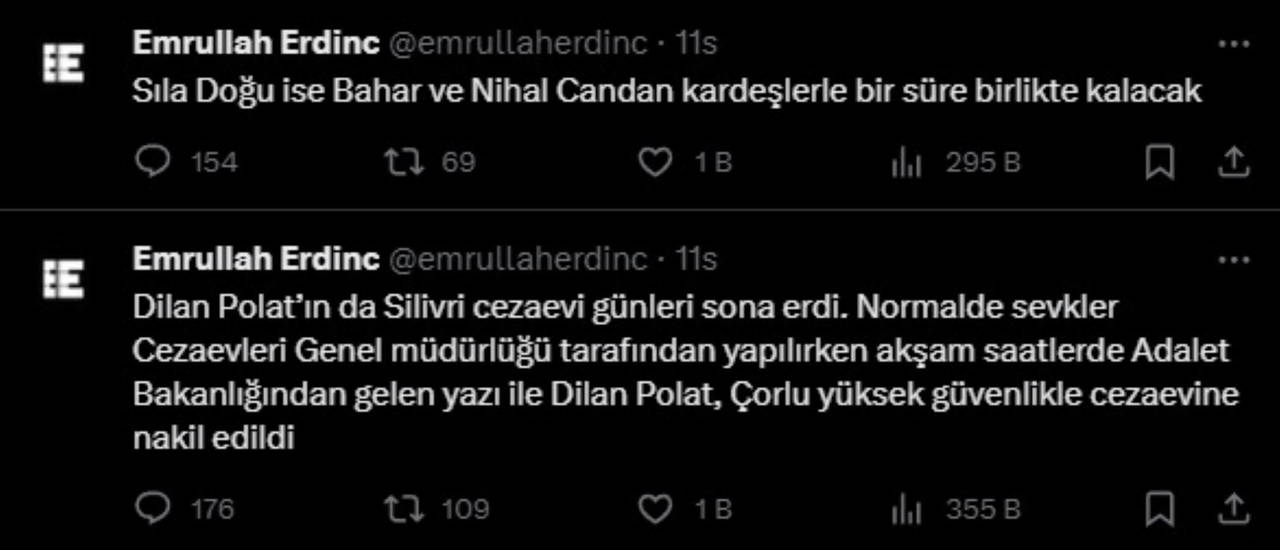 Gazeteci Emrullah Erdinç'in paylaşımıyla, Dilan Polat'ın da Silivri Cezaevi'ndeki günlerinin sona erdiği ortaya çıktı.