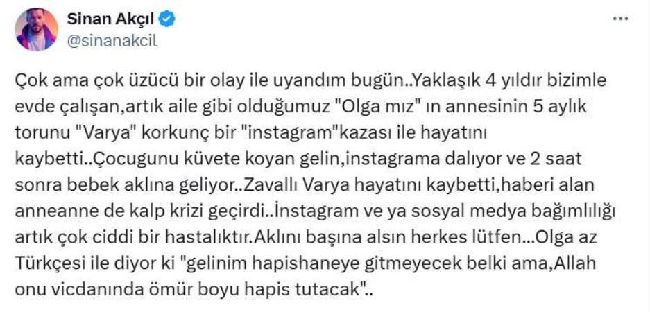 "Çok ama çok üzücü bir olay ile uyandım bugün. Yaklaşık 4 yıldır bizimle evde çalışan, artık aile gibi olduğumuz 'Olga'mız'ın annesinin 5 aylık torunu 'Varya' korkunç bir 'Instagram' kazası ile hayatını kaybetti. Çocugunu küvete koyan gelin, Instagram'a dalıyor ve 2 saat sonra bebek aklına geliyor. Zavallı Varya hayatını kaybetti, haberi alan anneanne de kalp krizi geçirdi. Instagram veya sosyal medya bağımlılığı artık çok ciddi bir hastalıktır. Aklını başına alsın herkes lütfen... Olga az Türkçesi ile diyor ki 'Gelinim hapishaneye gitmeyecek belki ama Allah onu vicdanında ömür boyu hapis tutacak.'"