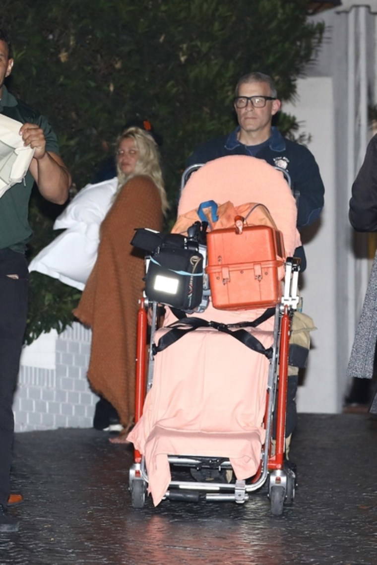 Britney Spears'ın dizlerinde sıyrıklar olduğu ve yastığı göğsüne doğru bastırırken dağınık görüntüsü dikkat çekti. Ünlü şarkıcının yanında korumaları vardı.