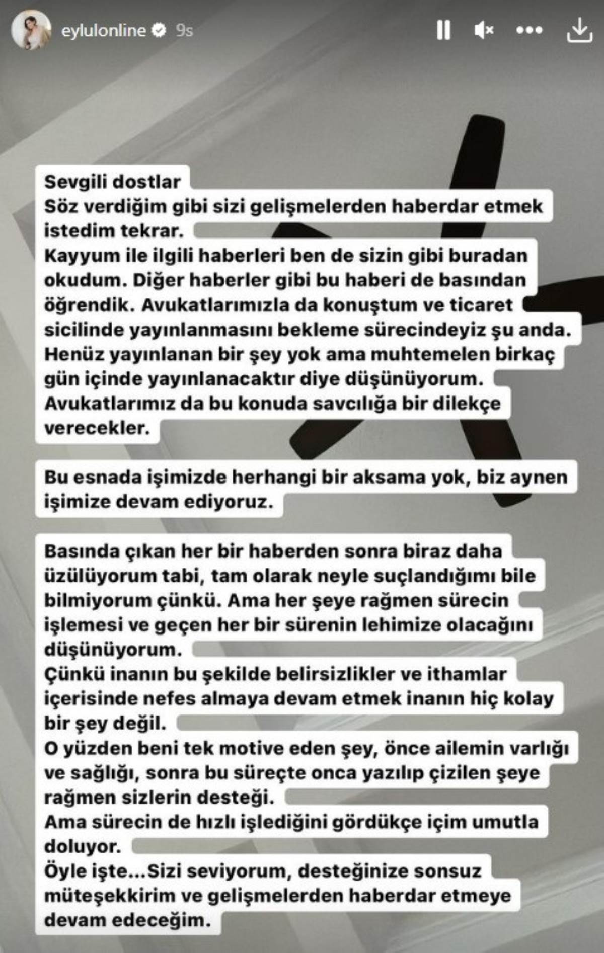 "Söz verdiğim gibi sizi gelişmelerden haberdar etmek istedim tekrar. Kayyum ile ilgili haberleri ben de sizin gibi buradan okudum. Diğer haberler gibi bu haberi de basından öğrendik. Avukatlarımızla da konuştum ve ticaret sicilinde yayınlanmasını bekleme sürecindeyiz şu anda. Henüz yayınlanan bir şey yok ama muhtemelen birkaç gün içinde yayınlanacaktır diye düşünüyorum. Avukatlarımız da bu konuda savcılığa dilekçe verecekler. Bu esnada işimizde herhangi bir aksama yok, biz aynen işimize devam ediyoruz."