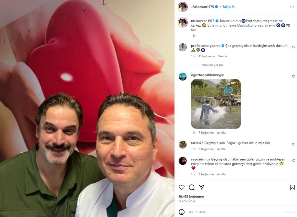 "Değerli sanatçımız (artık dostum) Ufuk Özkan'ı 17 gün önce karaciğer yetmezliği bulguları ile kliniğimize yatırmıştık. Süreç içinde karaciğer değerleri geriledi. Çok şükür nakillik bir durumu olmadı. Kendisini çok sevdiği mesleğine ve setlere devam edecek şekilde taburcu ettik. Bu süre zarfında arayan soran ve sevenleri onu hiç yalnız bırakmamıştı. Bundan sonraki günlerini sağlıkla geçirmesini diliyorum."
