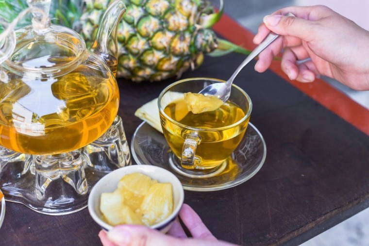 Ananası iyice yıkayıp, kabuklarını kalın kalın kesin. Diğer malzemelerle birlikte tencereye yerleştirin. Üzerine 1 litre su ekleyip, 15 dakika kısık ateşte kaynatın. Altını kapatıp poşet çayı ilave ederek, üzerine su koyun. Ilık veya soğuk olarak tüketebilirsiniz. Haftada 2-3 kere 1 bardak içebilirsiniz.