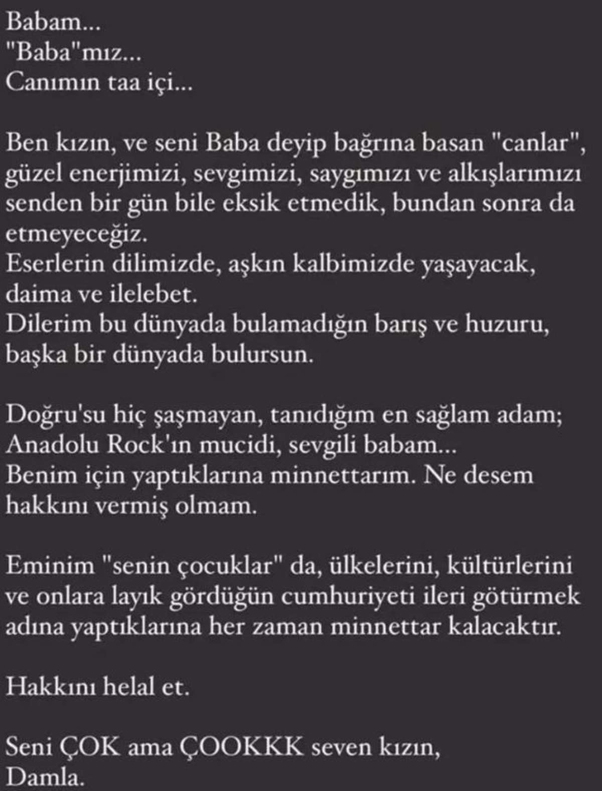 "Babam... Baba'mız... Canımın taa içi, ben kızın ve seni Baba detip bağrına basan "canlar", güzel enerjimizi, sevgimizi, saygımızı ve alkışlarımızı senden bir gün bile eskisk etmedik, bundan sonra da etmeyeceğiz. Eserlerin dilimizde, aşkın kalbimizde yaşayacak, daima ve ilelebet.