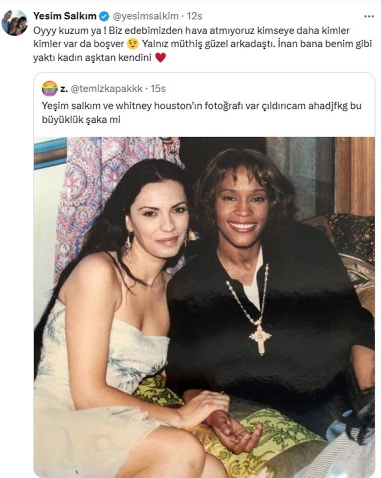 X platformunda bir kullanıcının,"Yeşim Salkım ve Whitney Houston fotoğrafı var çıldıracağım. Bu büyüklük şaka mı" notuyla yaptığı paylaşıma Salkım kayıtsız kalmadı.
