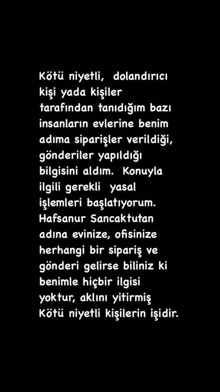“Tanıdığım bazı kişilerin evlerine, kötü niyetli dolandırıcılar tarafından benim adıma siparişler verildiği ve gönderiler yapıldığı bilgisine ulaştım. Konuyla ilgili gerekli yasal işlemleri başlatıyorum. Hafsanur Sancaktutan adına evinize veya ofisinize herhangi bir sipariş ya da gönderi gelirse, bilin ki bunun benimle hiçbir ilgisi yoktur. Bu, aklını yitirmiş kötü niyetli kişilerin işidir.”
