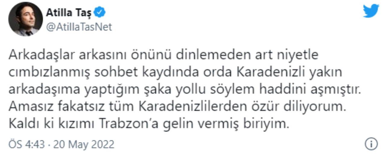 Gelen tepkilerin ardından Twitter hesabından özür dileyen Atilla Taş, şu ifadeleri kullandı: