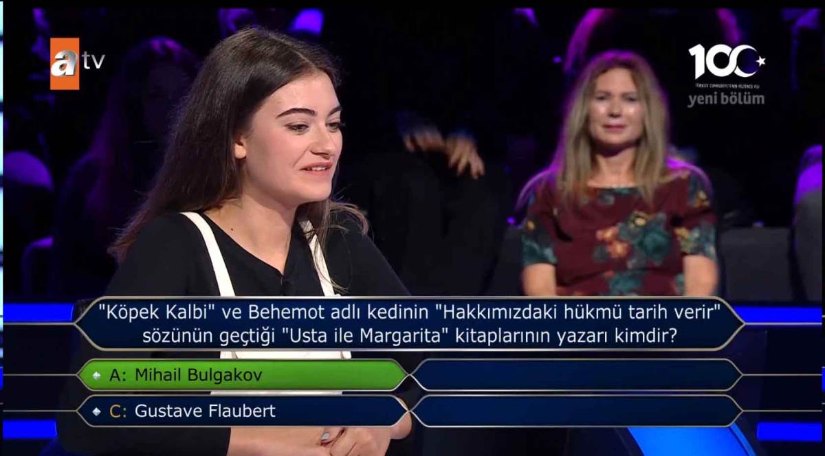 Yarışmacı ikinci baraj sorusuna kadar geldi. Baraj sorusunda yarışmacının karşısına, "Köpek Kalbi ve Behemot adlı kedinin 'hakkımızda hükmü tarih verir' sözünün geçtiği 'Usta ile Margarita' kitaplarının yazarı kimdir?" sorusu çıktı.