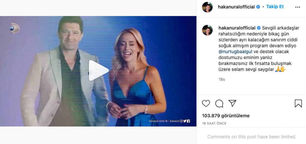 “Sevgili arkadaşlar, rahatsızlığım nedeniyle birkaç gün sizlerden ayrı kalacağım. Sanırım ciddi soğuk almışım. Program devam ediyor. Nur Tuğba Algül ve destek olacak dostumuzu, eminim yalnız bırakmazsınız. İlk fırsatta buluşmak üzere.”