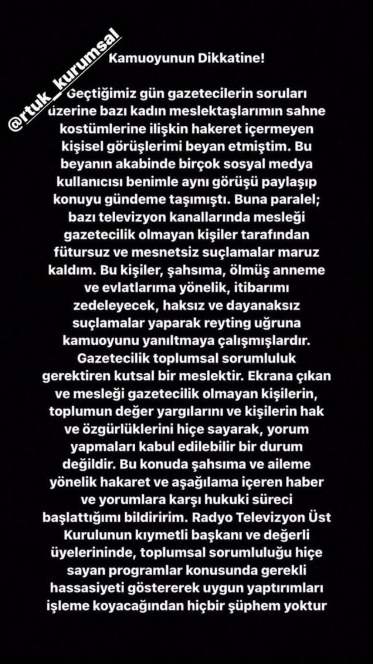 "Reyting uğruna kamuoyunu yanıltmaya çalıştılar. Hak etmediğim hakaretlere maruz kaldım. Bu konuda şahsıma ve aileme yönelik hakaret ve aşağılama içeren haber ve yorumlara karşı hukuki süreci başlattığımı söylemek isterim"