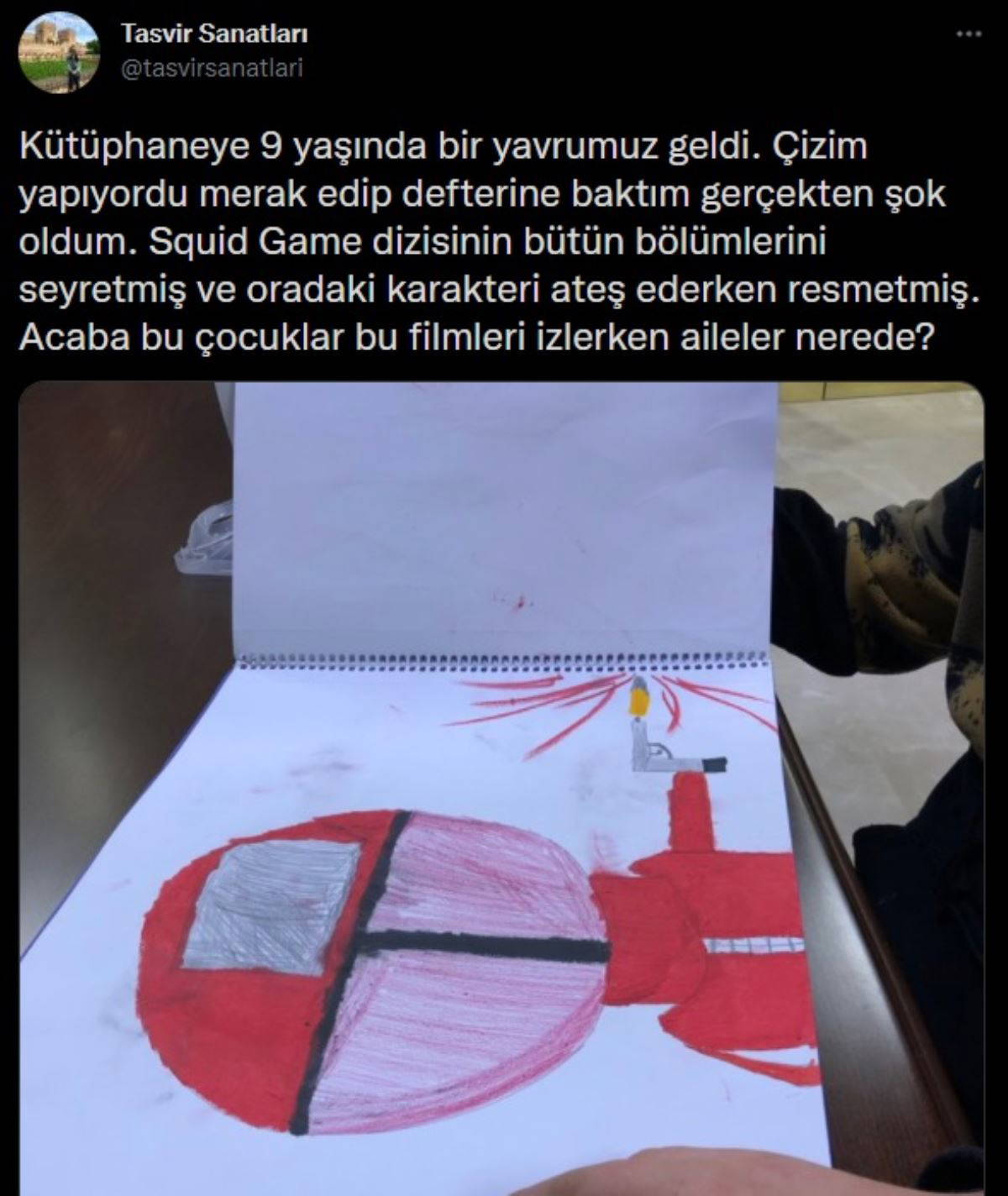 İddiaya göre, dizideki pembe kostümlü karakterleri silahla ateş ederken resmeden küçük çocuk, görevliye Squid Game’in bütün bölümlerini izlediğini söylemiş.