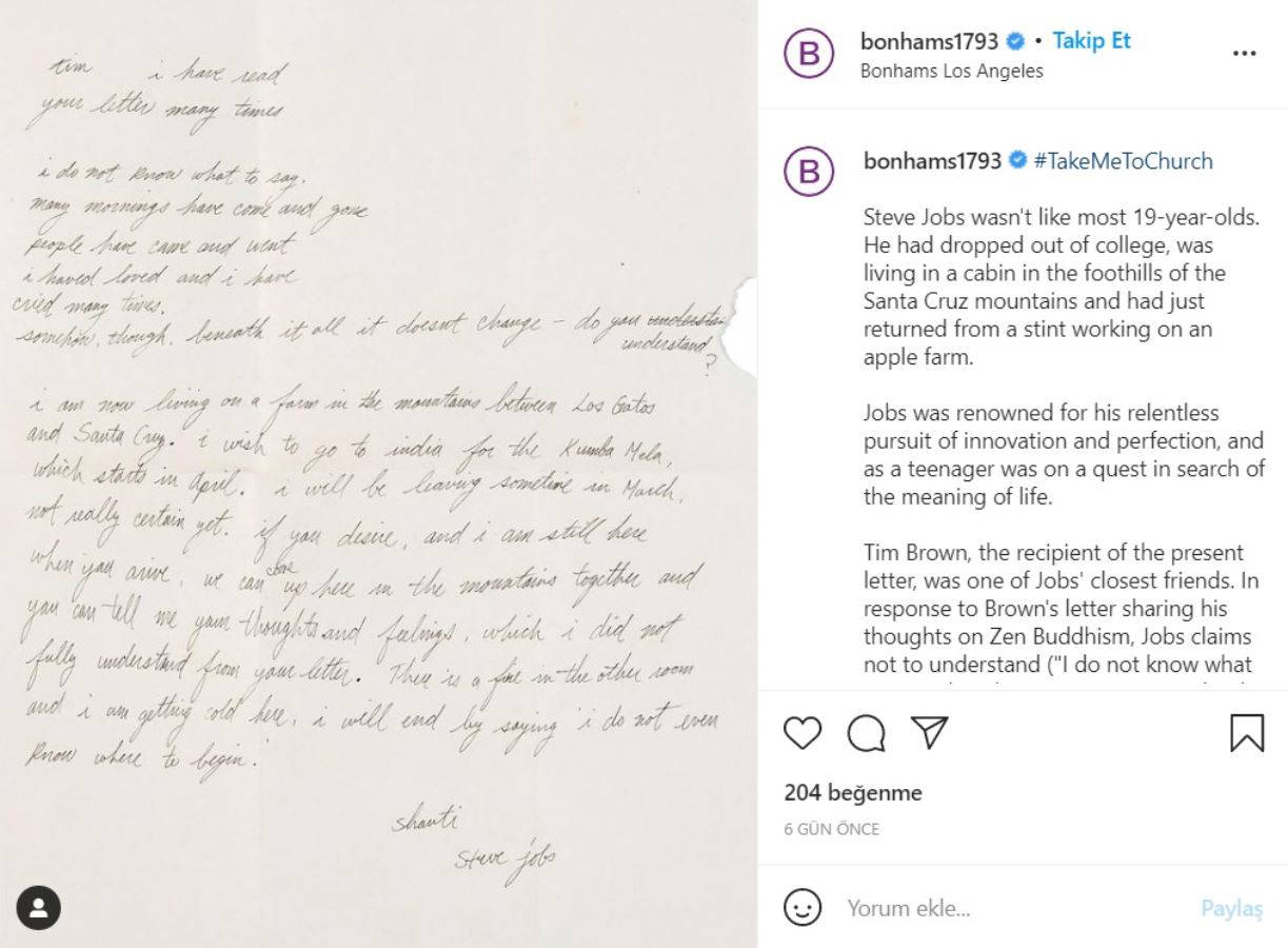 Bonhams’ın bilim ve teknoloji tarihi direktörü Adam Stackhouse geçen hafta yaptığı açıklamada, “Bu mektup bize dünyanın en büyük yaratıcılarından ve girişimcilerinden birinin zihinsel süreçlerine dair büyüleyici bir fikir veriyor. Daha önce açık artırmada Jobs’un imzalı mektupları çıkmamıştı ve kesinlikle bunun kadar açıklayıcı bir materyal olmamıştı” dedi.
