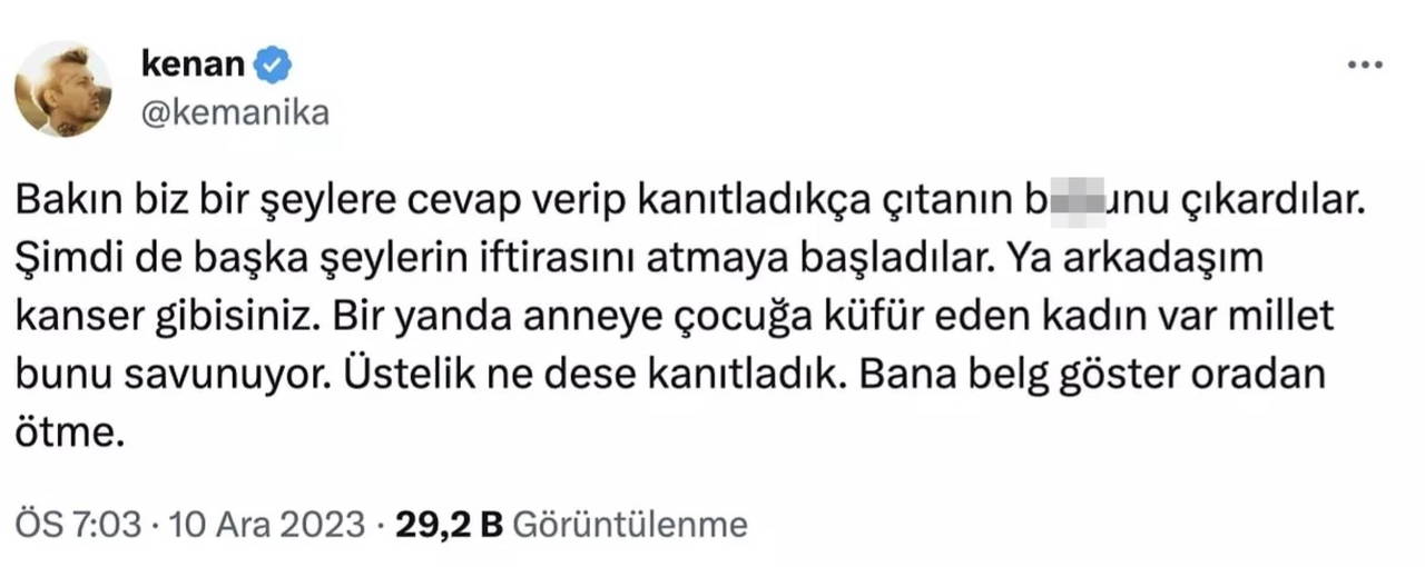 Eylül Öztürk'ün eşi Kenan Özkan ise olay yaratan iddialara "Bakın biz bir şeylere cevap verip kanıtladıkça çıtanın b..kunu çıkardılar" diyerek yanıt verdi.
