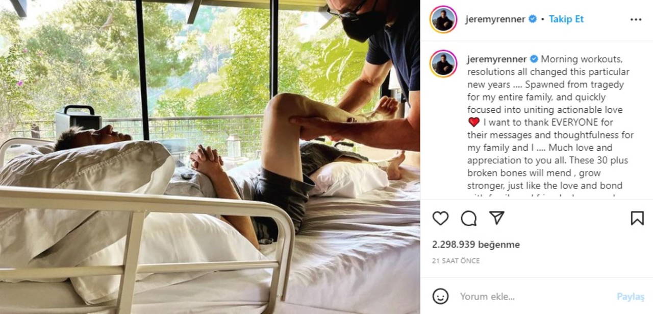 Renner paylaşımında, “Aileme ve bana gönderdiğiniz mesajlarınız ve düşünceleriniz için herkese teşekkür etmek istiyorum. Hepinize çokça sevgi ve saygılar. Bu 30’dan fazla kırık kemik, tıpkı aile ve arkadaşlar arasındaki sevgi ve bağın derinleşmesi gibi onarılacak, güçlenecek" ifadelerini kullandı.