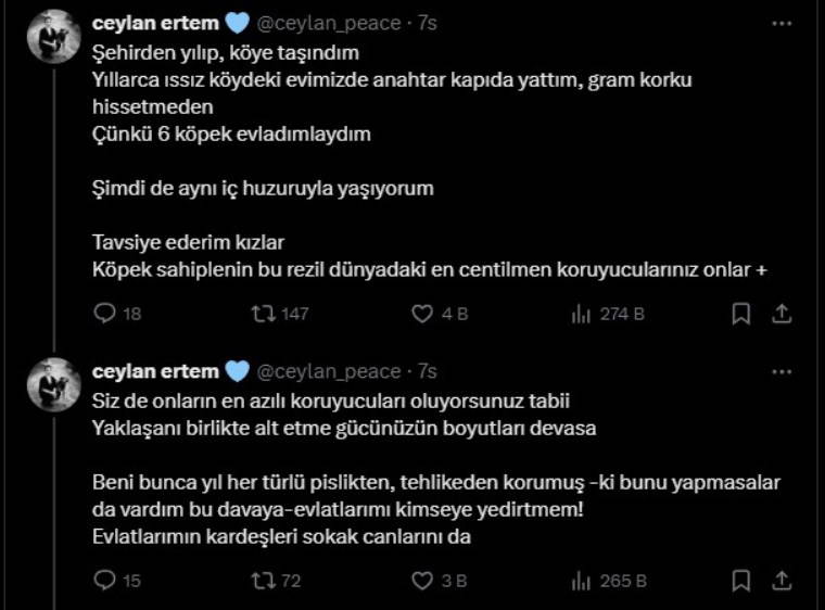 "Şehirden yılıp, köye taşındım. Yıllarca ıssız köydeki evimizde anahtar kapıda yattım, gram korku hissetmeden çünkü 6 köpek evladımlaydım. Şimdi de aynı iç huzuruyla yaşıyorum. Tavsiye ederim kızlar, köpek sahiplenin; bu rezil dünyadaki en centilmen koruyucularınız onlar."