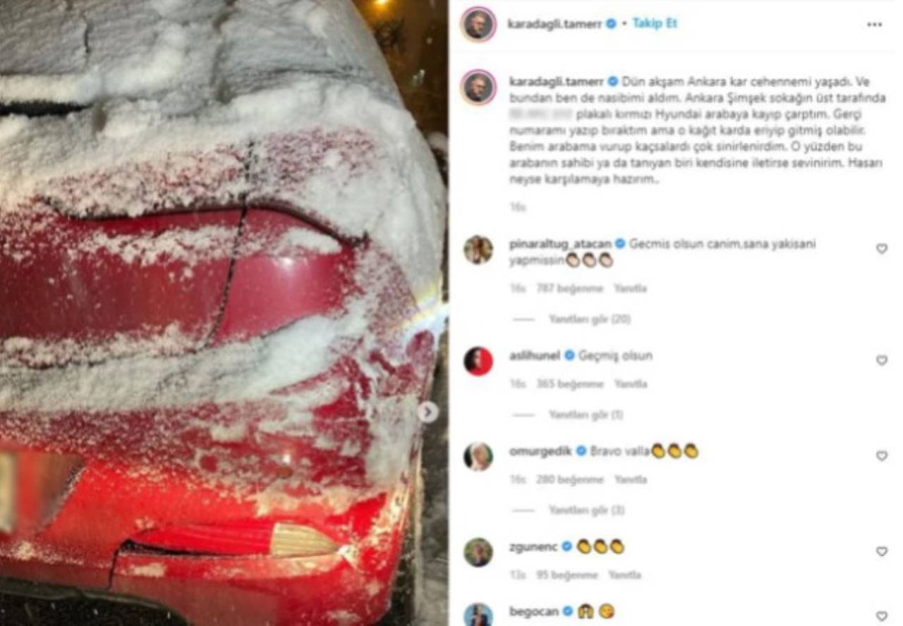 Karın etkisini gösterdiği saatlerde dışarıda olan Tamer Karadağlı aracını kontrol edemeyince, başka bir otomobile çarptı. Çarptığı aracın hasarını karşılamak isteyen Karadağlı, sosyal medyadan duyuru yaptı.