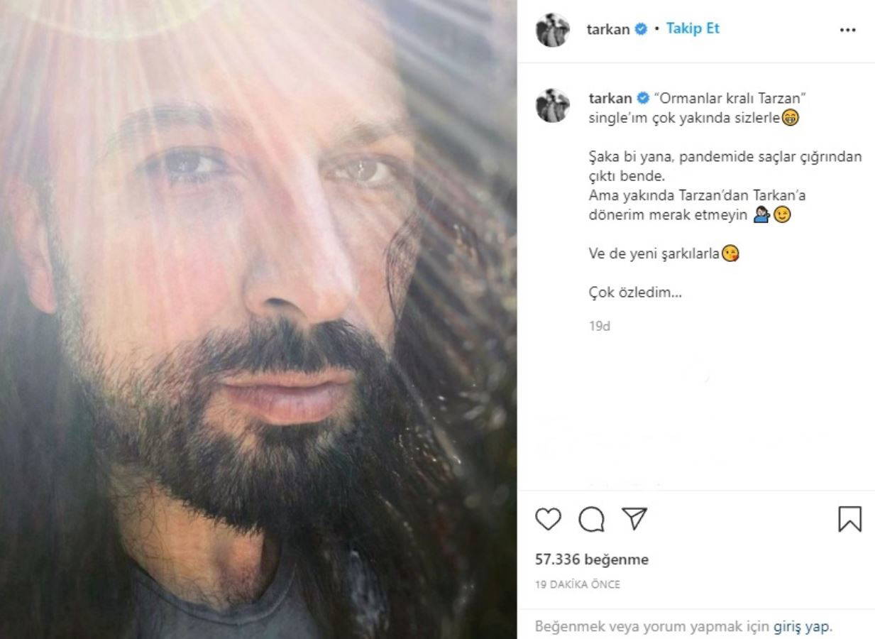 "Ormanlar kralı Tarzan single’ım çok yakında sizlerle. Şaka bi yana, pandemide saçlar çığrından çıktı bende. Ama yakında Tarzan’dan Tarkan’a dönerim merak etmeyin. Ve de yeni şarkılarla. Çok özledim…"