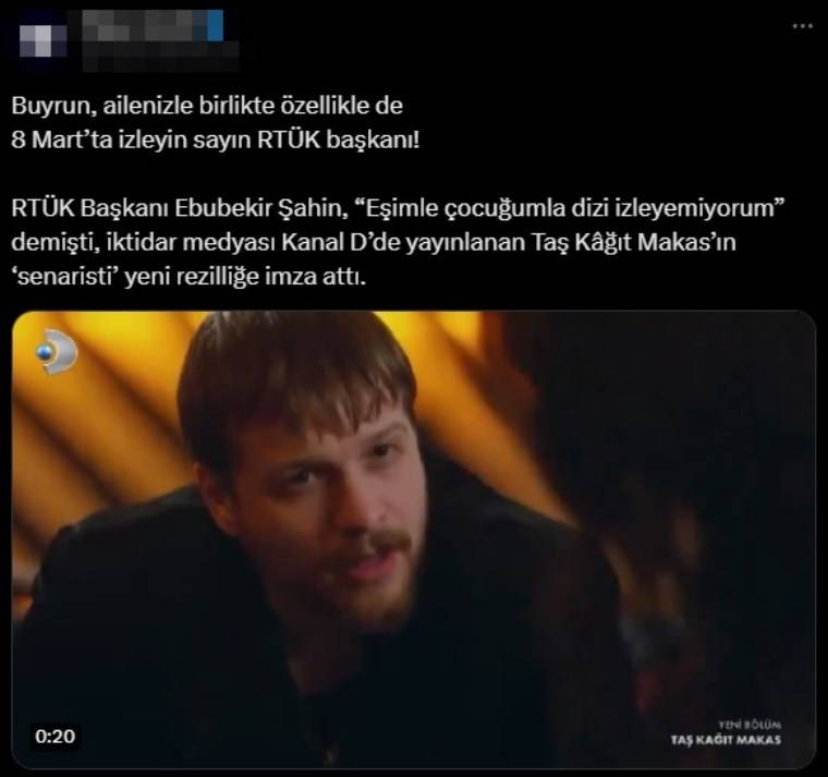 RTÜK Başkanı Ebubekir Şahin, sosyal medya hesabından yaptığı paylaşımda, kadın istismarı içeren ve kadınları aşağılayan yapımları incelediklerini belirtti.