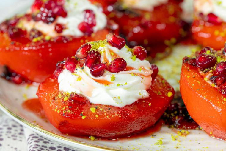 Ayvaların kabuklarını tencerenin tabanına dizin.Ayvaları da tencereye ekleyin.Ardından şekeri, ayvaların üzerine paylaştırın.Su, limon suyu, nar suyu, ayva çekirdekleri ve baharatlarını de tencereye yerleştirin.Tencereyi ocağa alın ve kaynayana kadar yüksek ateşte, ardından kısık ateşte 30-35 dakika civarı pişirin. Sürenin sonunda suyunu iyice çekip renk alan ayvaları bir bıçakla yardımıyla pişip pişmediğini kontrol edin.Pişmişse ilk sıcaklığının geçmesi için ocaktan alın ve dinlenmeye bırakın.Ayva tatlısı hazır. Pişen ayvaları servis tabağına alın ve tencerede kalan şerbetinden hafifçe üzerine sürün. Kaymak ve Antep fıstığı ilavesiyle ılık ya da soğuk olarak tatlıları servis edebilirsiniz.