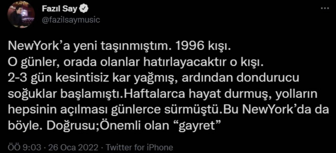 “New York’a yeni taşınmıştım. 1996 kışı. O günler, orada olanlar hatırlayacaktır o kışı. 2-3 gün kesintisiz kar yağmış, ardından dondurucu soğuklar başlamıştı. Haftalarca hayat durmuş, yolların hepsinin açılması günlerce sürmüştü. Bu New York’ta da böyle. Doğrusu; önemli olan ‘gayret’”.