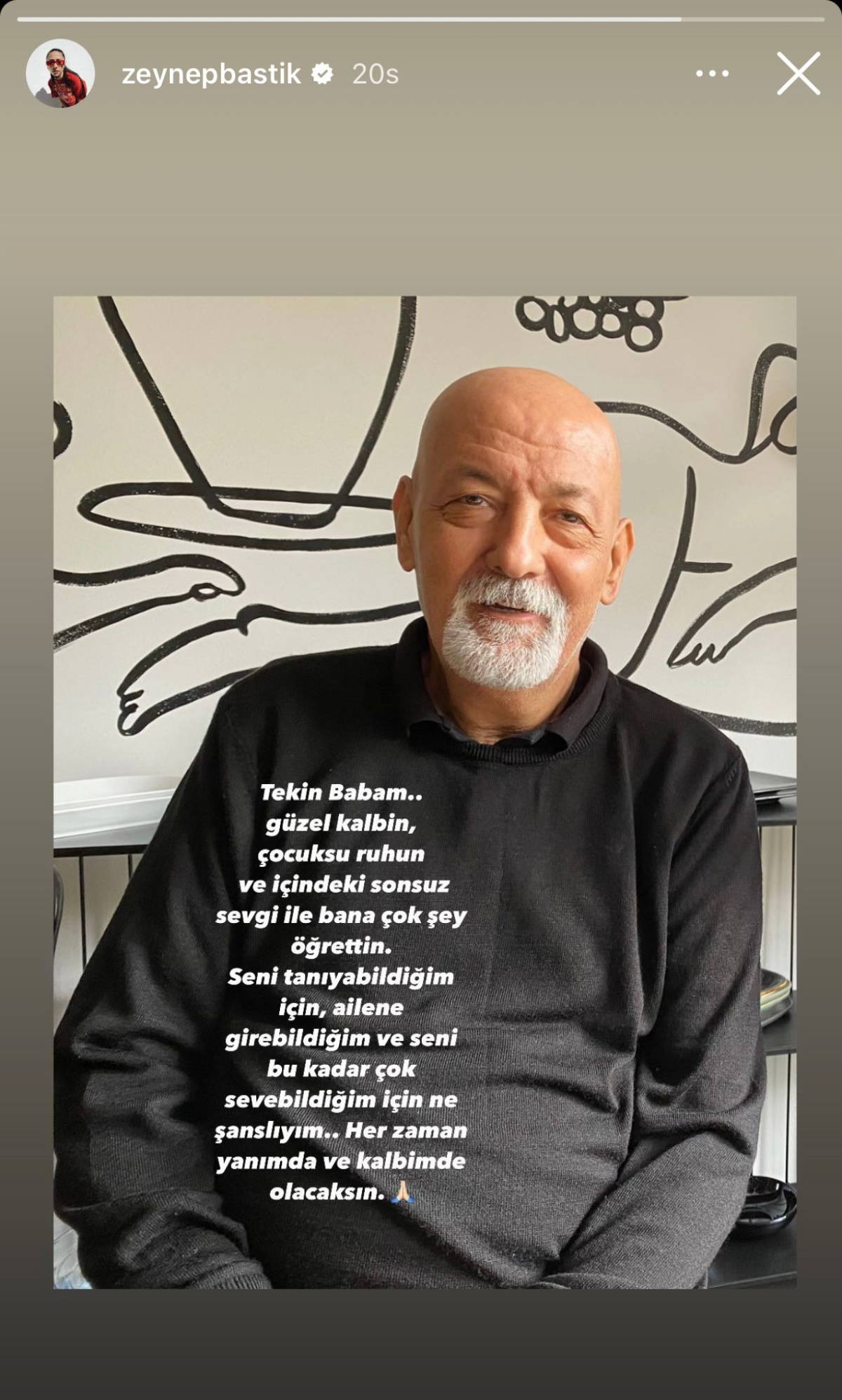 Zeynep Bastık ise yaptığı paylaşım, "Tekin babam... Güzel kalbin, çocuksu ruhum ve içindeki ruhun ve içindeki sonsuz sevgi ile bana çok şey öğrettin. Seni tanıyabildiğim için ailene girebildiğim ve seni bu kadar çok sevebildiğim için ne şanslıyım... Her zaman yanımda ve kalbimde olacaksın" notunu düştü.