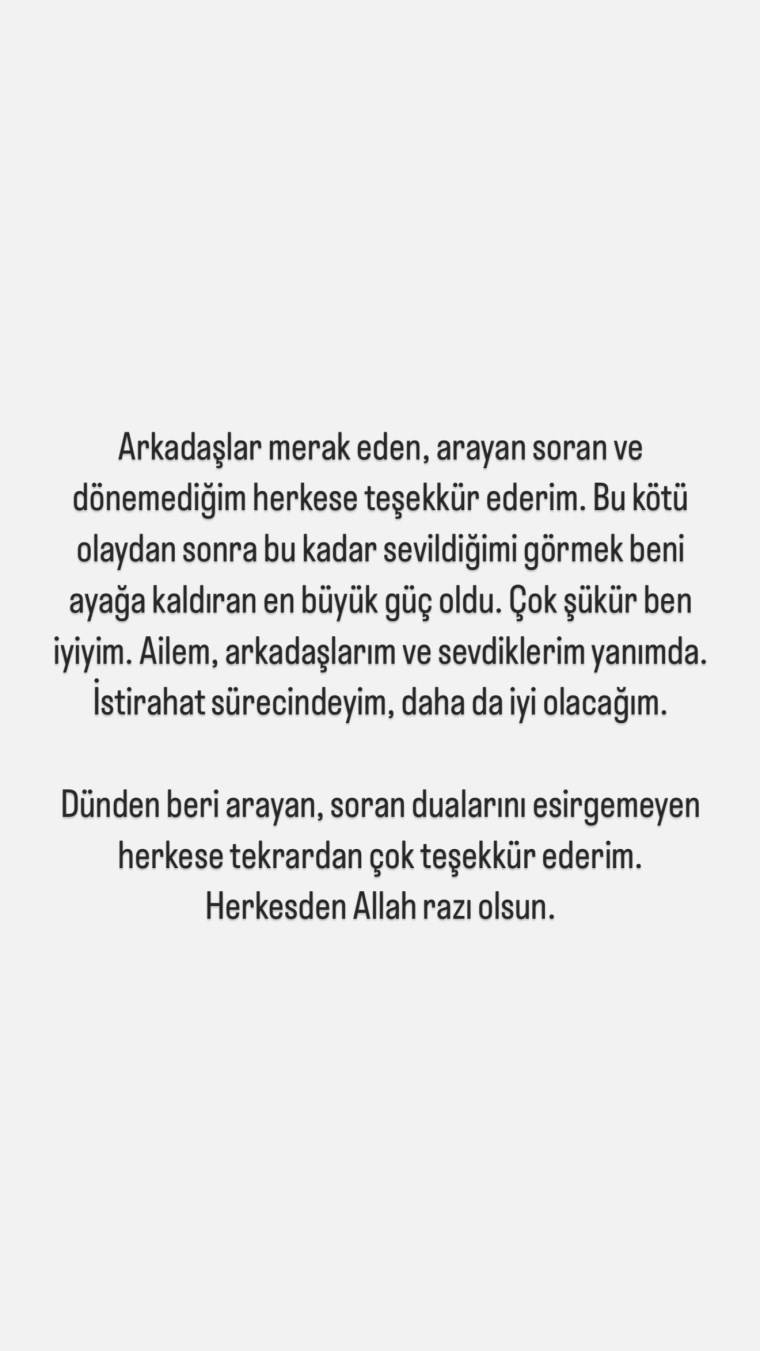 "Arkadaşlar merak eden, arayan soran ve dönemediğim herkese teşekkür ederim. Bu kötü olaydan sonra bu kadar sevildiğimi görmek beni ayağa kaldıran en büyük güç oldu. Çok şükür ben iyiyim. Ailem, arkadaşlarım ve sevdiklerim yanımda, istirahat sürecindeyim, daha da iyi olacağım.