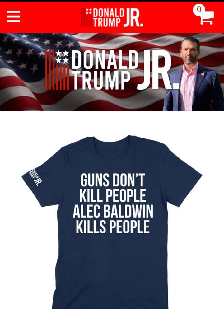 Don Jr’ın sahip olduğu online mağazada satılan ve kendi sosyal medya hesabından da tanıttığı tişörtlerin üzerinde “Silahlar insanları öldürmez. Alec Baldwin insanları öldürür” yazıyor. Ayrıca tişörtler, 27.99 dolardan satılıyor.