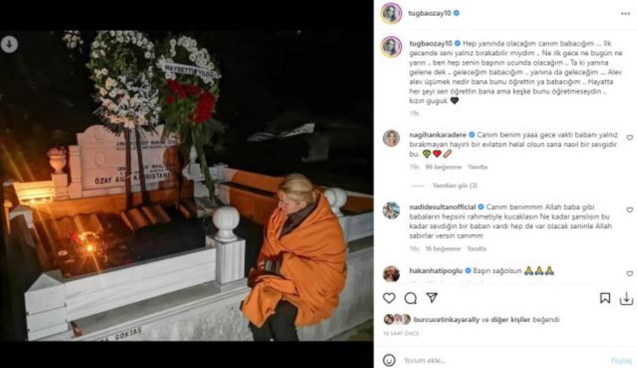 O anları Instagram hesabından yayınlayan ünlü isim, "Hep yanında olacağım canım babacığım… İlk gecende seni yalnız bırakabilir miydim? Ne ilk gece ne bugün ne yarın... Ben hep senin başının ucunda olacağım. Ta ki yanına gelene dek. Geleceğim babacığım... Yanına da geleceğim… Alev alev üşümek nedir bana bunu öğrettin ya babacığım. Hayatta her şeyi sen öğrettin bana ama keşke bunu öğretmeseydin. Kızın guguk..." ifadelerini kullandı.