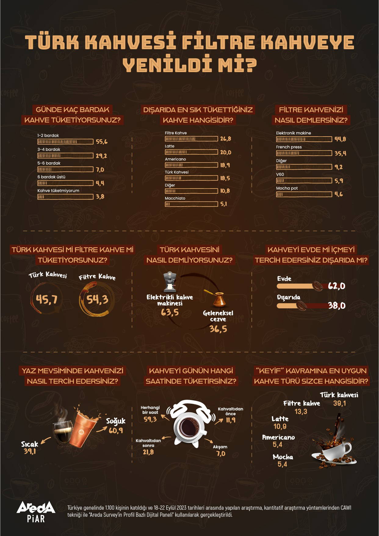 Araştırmaya göre tüketicilerin yüzde 54,3’ü filtre kahvenin, yüzde 45,7’si Türk kahvesinin tarafını tutuyor. Kahveyi tüketicilerin yüzde 44,8’i elektronik makine, yüzde 35,4’ü French Press, yüzde 5,9’u V60, yüzde 4,6’sı Mocha Pot ile demlediğini belirtiyor. Yüzde 9,2’si ise diğer seçeneğinde bir araya geliyor.