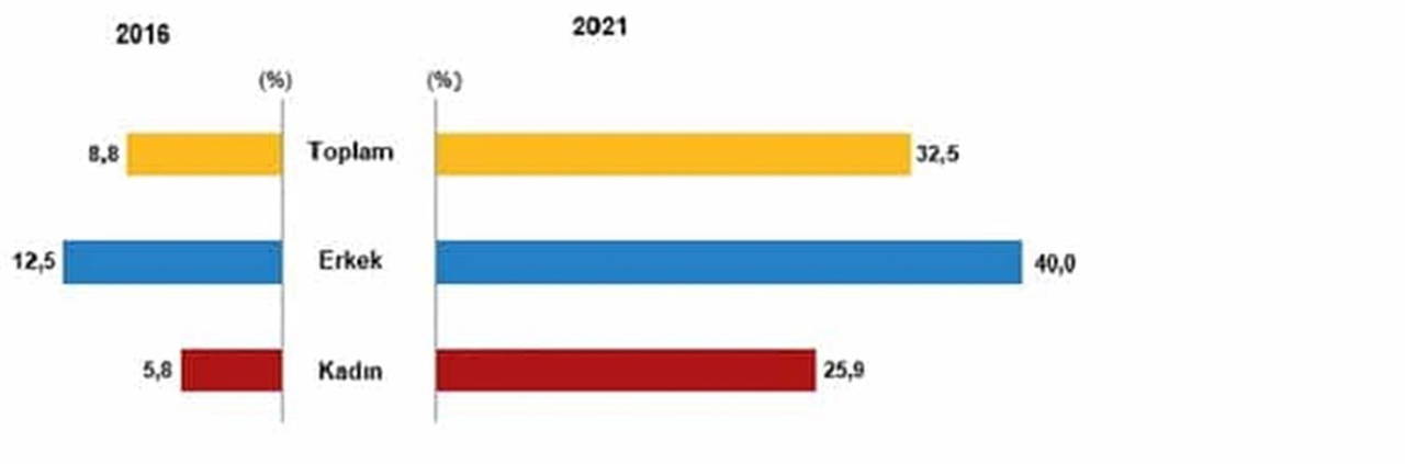 Hanehalkı bilişim teknolojileri kullanım araştırması sonuçlarına göre, İnternet kullanan 65-74 yaş grubundaki bireylerin oranı 2016 yılında yüzde 8,8 iken bu oran 2021 yılında yüzde 32,5’e yükseldi. İnternet kullanan yaşlı bireyler cinsiyete göre incelendiğinde, erkeklerin kadınlardan daha fazla İnternet kullandığı görüldü. İnternet kullanan yaşlı erkeklerin oranı 2021 yılında yüzde 40,0 iken yaşlı kadınların oranı yüzde 25,9 oldu.