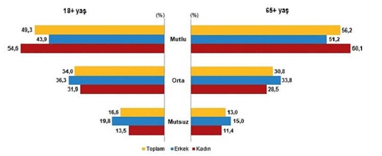 Yaşam memnuniyeti araştırması sonuçlarına göre, mutlu olduğunu beyan eden 18 ve daha yukarı yaştaki bireylerin oranı 2021 yılında yüzde 49,3 iken bu oran 65 ve daha yukarı yaştaki bireyler için yüzde 56,2 oldu. Yaşlı bireylerin genel mutluluk düzeyi cinsiyete göre incelendiğinde, 2021 yılında erkeklerin yüzde 51,2'si, kadınların ise yüzde 60,1'i mutlu olduğunu beyan etti.