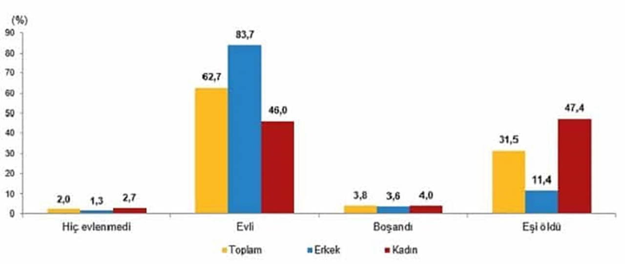 Yaşlı erkek nüfusun 2021 yılında yüzde 1,3'ünün hiç evlenmemiş, yüzde 83,7'sinin resmi nikahla evli, yüzde 3,6'sının boşanmış, yüzde 11,4'ünün eşi ölmüş olduğu görülürken yaşlı kadın nüfusun yüzde 2,7'sinin hiç evlenmemiş, yüzde 46'sının resmi nikahla evli, yüzde 4'ünün boşanmış, yüzde 47,4'ünün ise eşi ölmüş olduğu görüldü.