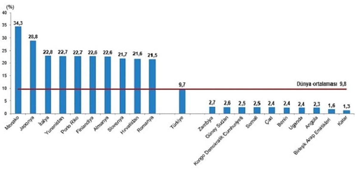 En yüksek yaşlı nüfus oranına sahip ilk üç ülke sırasıyla yüzde 34,3 ile Monako, yüzde 28,8 ile Japonya ve yüzde 22,8 ile İtalya oldu.
