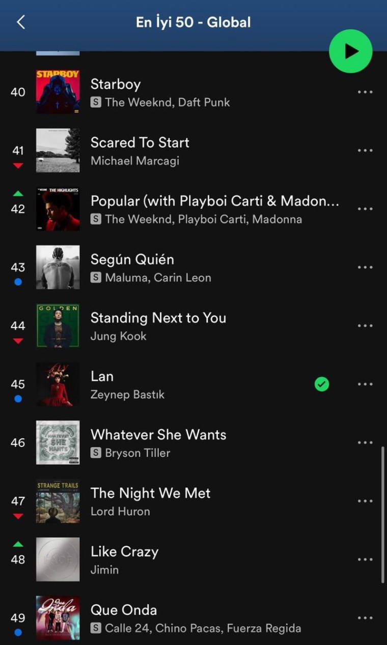 The Weekend, Maluma gibi dünyaca ünlü şarkıcıların hemen arkasında yer alan Zeynep Bastık'ın yeni şarkısı 'Lan', an itibarıyla dünyanın en çok dinlenen 45'inci şarkısı.