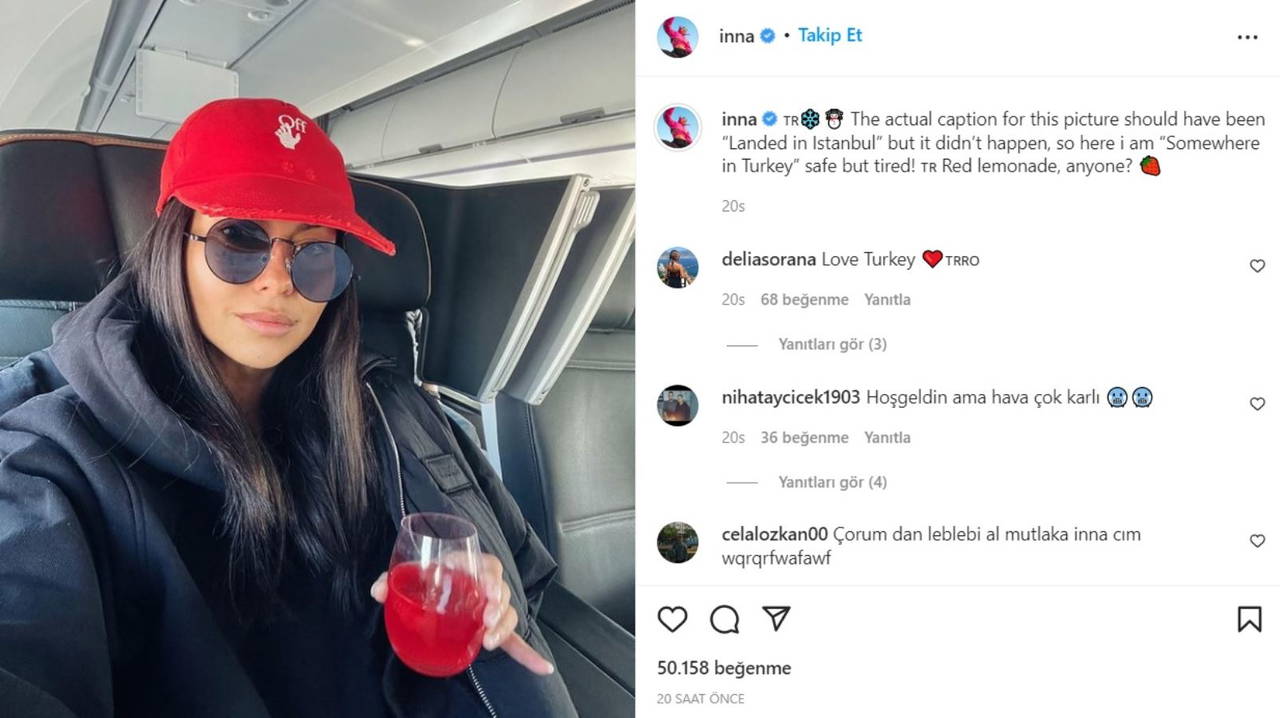 Hava şartları nedeniyle Çorlu’ya inmek zorunda kalan Inna, Instagram hesabında paylaştığı fotoğrafında "Bu fotoğrafta İstanbul'da olduğumu göstermeliydim. Ama olmadı. Türkiye'de bir yerde güvendeyim. Fakat yorgunum" dedi.