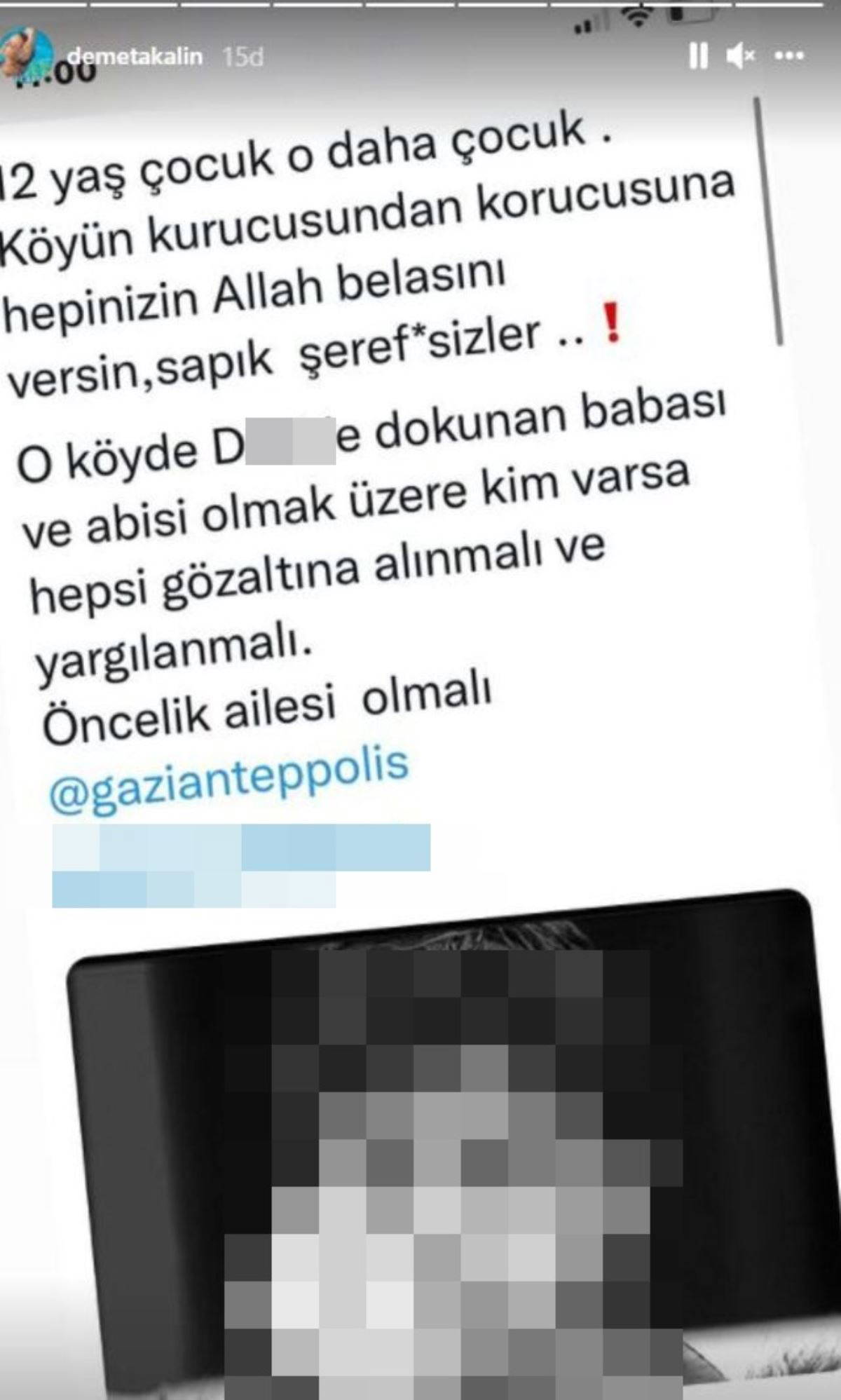 Sosyal medya hesabından bir paylaşım yapan Akalın; "Köyün kurucusundan koruyucusuna hepiniziz Allah belasını versin, sapık şerefsizler. O köyde D.'ye dokunan babası ve abisi olmak üzere kim varsa hepsi gözaltına alınmalı" ifadelerini kullandı.